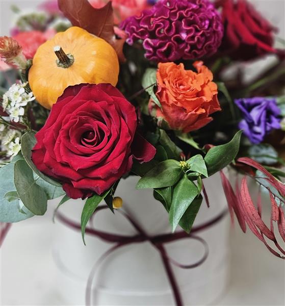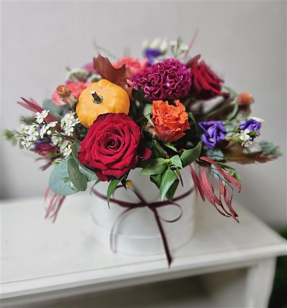 A vibrant autumnal hat box arrangement of gorgeous reds, oranges and pinks. Flowers include roses, celosia, lisianthus, was flower and carnations. The arrangement includes a small pumpkin decoration.
