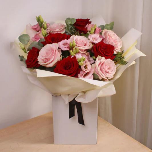 Send this to someone you have a crush on. Stunning roses in red and pink with stunning lisianthus and foliags in lovely handtied bag with a black ribbon.