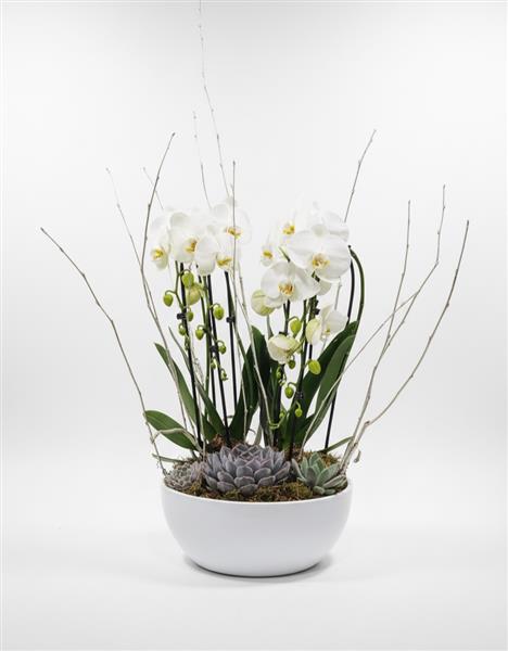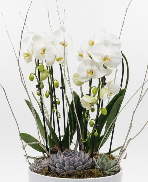 This stunning phalaenopsis and succulent plant arrangement comes in a cermic white containerfinished off with twigs for a modern feel.