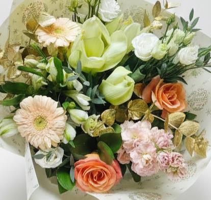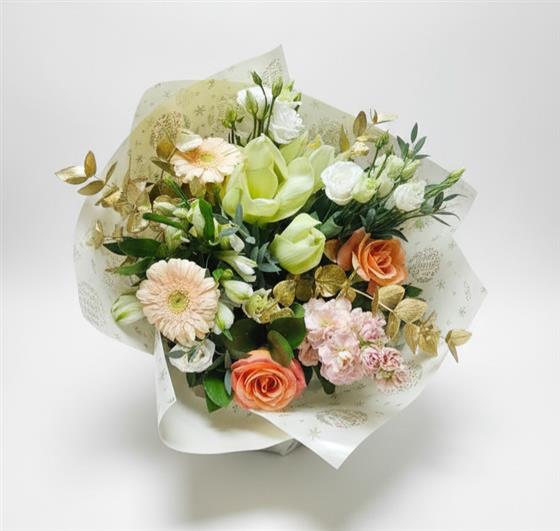 A lovely pastel Chrissmassy bouquet with gold eucalyptus. Flowers include white amarylis, lisianthus, roses, and germini.