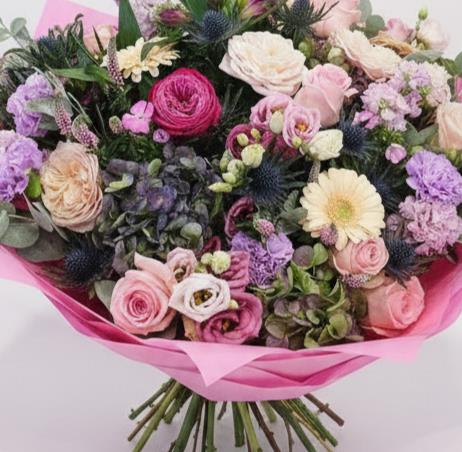 A stunning handtied bouquet with many favourites. Flowers include roses, eryngium, hydrangea, lisianthus and carnations.