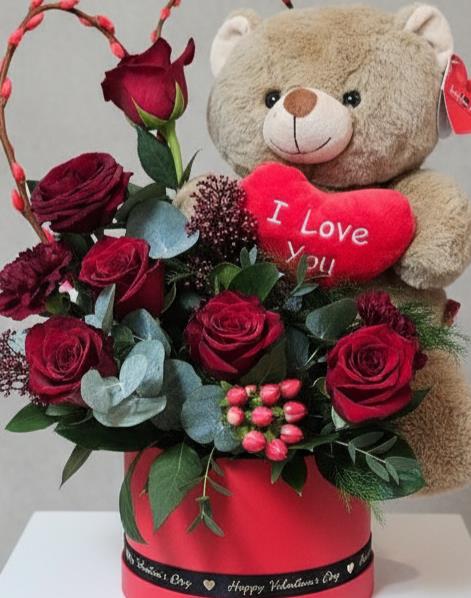 Red rose hat box arrangement with an I Love You teddy bear, finished with a salix heart. The teddy may differ to that photographed.