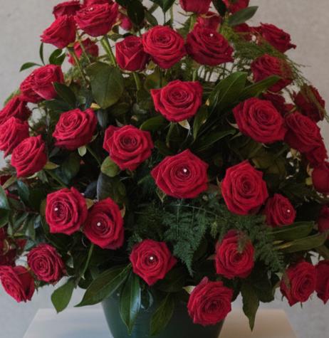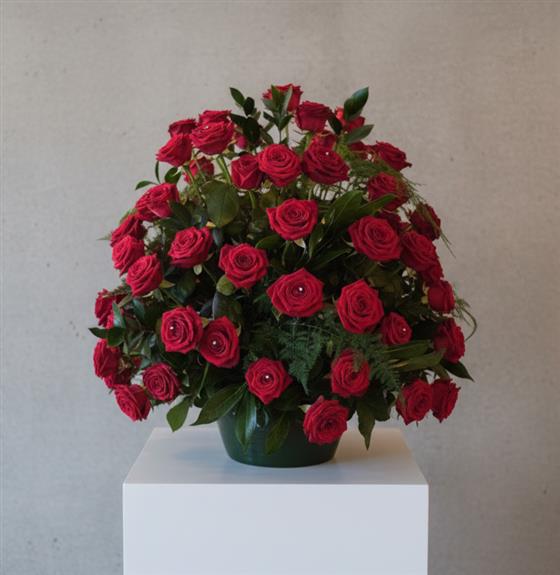 A stunning red rose arrangement in a ceramic container. For the wow factor. This arrangement will have 80 red roses in it complimented with mixed foliages.
