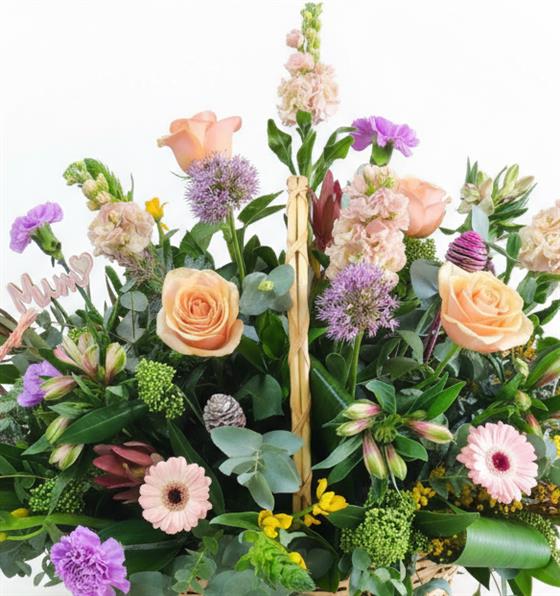 A show stopper basket arrangement with gloriously scented stock, roses, alliums, carnations and germini, finished off with a keepsake Mum pick.